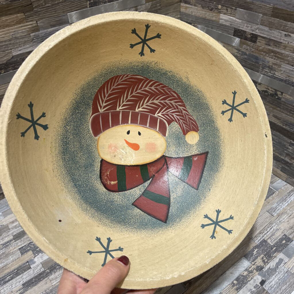 Folk Art Style Holiday Snowman Wood Bowl ACCESSORIES 12Wx3.75H