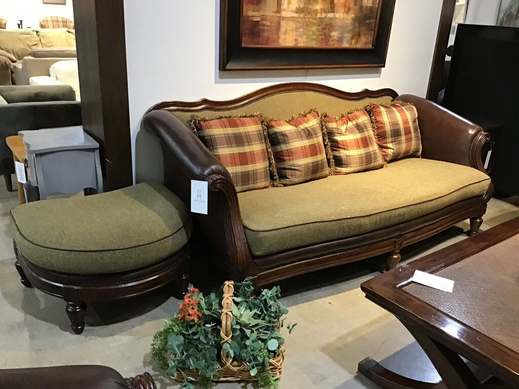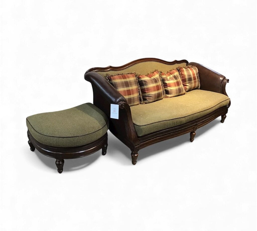 Thomasville Sorrento Single Seat Leather & Wood Frame w/ Ottoman & Pillows SOFA 90Wx36Dx40H